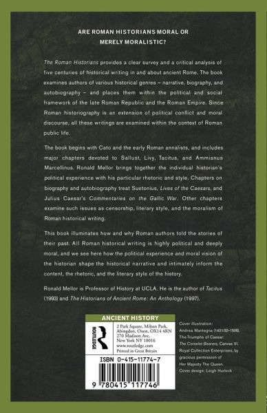 The Romans' devotion to their past pervades almost every aspect of their culture. But the clearest image of how the Romans wished to interpret their past is found in their historical writings. This book examines in detail the major Roman historians: * Sallust * Livy * Tacitus * Ammianus as well as the biographies written by: * Nepos * Tacitus * Suetonius * the Augustan History * the autobiographies of Julius Caesar and the Emperor Augustus. Ronald Mellor demonstrates that Roman historical writing was regarded by its authors as a literary not a scholarly exercise, and how it must be evaluated in that context. He shows that history writing reflected the political structures of ancient Rome under the different regimes.