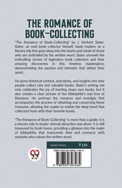 "The Romance of Book-Collecting" by J. Herbert Slater. Slater, an avid book collector himself, leads readers on a literary trip that goes deep into the hearts and minds of those who are enthralled by the written word. Slater unravels the enthralling stories of legendary book collectors and their amazing discoveries in this timeless masterpiece, demonstrating the passion and intensity that define their quest. He gives historical context, anecdotes, and insights into why people collect rare and valuable books. Slater's writing not only celebrates the joy of hunting down rare books, but it also creates a clear picture of the bibliophile's real love of literature. He portrays the romance and nostalgia that accompanies the process of obtaining and conserving these treasures, allowing the reader to realize the deep bond that collectors have with their favorite books. "The Romance of Book-Collecting" is more than a guide; it is a sincere ode to books' eternal attraction and allure. It is still treasured by book lovers, providing a glimpse into the realm of bibliophilia that transcends time and connects with anybody who values the written word.
