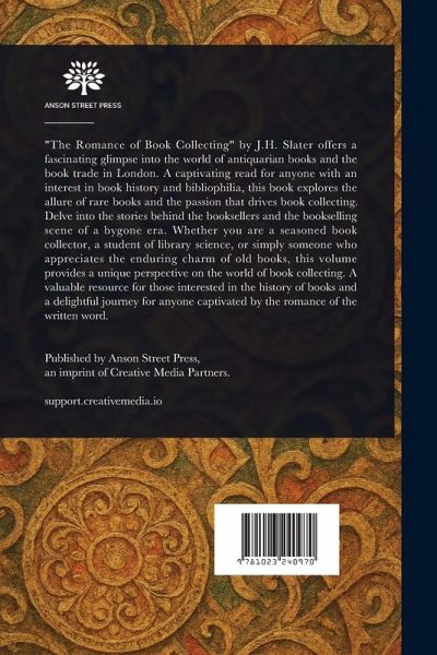 "The Romance of Book Collecting" by J.H. Slater offers a fascinating glimpse into the world of antiquarian books and the book trade in London. A captivating read for anyone with an interest in book history and bibliophilia, this book explores the allure of rare books and the passion that drives book collecting. Delve into the stories behind the booksellers and the bookselling scene of a bygone era. Whether you are a seasoned book collector, a student of library science, or simply someone who appreciates the enduring charm of old books, this volume provides a unique perspective on the world of book collecting. A valuable resource for those interested in the history of books and a delightful journey for anyone captivated by the romance of the written word. This work has been selected by scholars as being culturally important, and is part of the knowledge base of civilization as we know it. This work is in the public domain in the United States of America, and possibly other nations. Within the United States, you may freely copy and distribute this work, as no entity (individual or corporate) has a copyright on the body of the work. Scholars believe, and we concur, that this work is important enough to be preserved, reproduced, and made generally available to the public. We appreciate your support of the preservation process, and thank you for being an important part of keeping this knowledge alive and relevant.