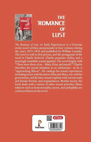 The Romance of Lust, or Early Experiences is a Victorian erotic novel written anonymously in four volumes during the years 1873-1876 and published by William Lazenby. The novel is told in first person, and the protagonist of the novel is Charlie Roberts. Charlie possesses virility, and a seemingly insatiable sexual appetite. The novel begins with "There were three of us-Mary, Eliza, and myself." Charlie describes his sexual initiation as an adolescent-as he is "approaching fifteen". He catalogs his sexual experiences including incest with his sisters Eliza and Mary, sex with his governesses, and his later sexual exploits with various male and female friends, and acquaintances. Besides incest, the book deals with a variety of other sexual activities. Taboo subjects such as homosexuality, incest, and pedophilia are common themes in the novel.