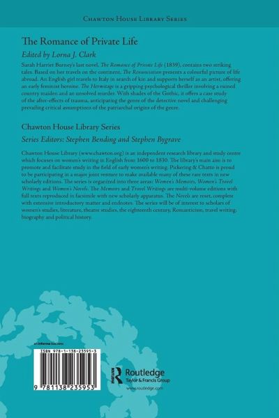 Contains two tales - "The Renunciation", which presents a colourful picture of life abroad, when an English girl travels to Italy in search of kin and supports herself as an artist, offering an early feminist heroine; and, "The Hermitage", a psychological thriller involving a ruined country maiden and an unsolved murder.