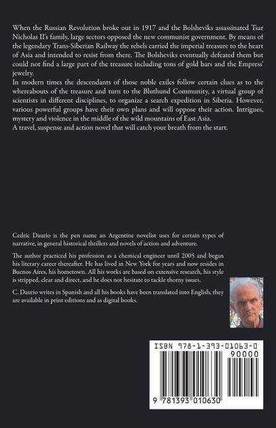When the Russian Revolution broke out in 1917 and the Bolsheviks assassinated Tsar Nicholas II's family, large sectors opposed the new communist government. By means of the legendary Trans-Siberian Railway the rebels carried the imperial treasure to the heart of Asia and intended to resist from there. The Bolsheviks eventually defeated them but could not find a large part of the treasure including tons of gold bars and the Empress' jewelry. In modern times the descendants of those noble exiles follow certain clues as to the whereabouts of the treasure and turn to the Bluthund Community, a virtual group of scientists in different disciplines, to organize a search expedition in Siberia. However, various powerful groups have their own plans and will oppose their action. Intrigues, mystery and violence in the middle of the wild mountains of East Asia. A travel, suspense and action novel that will catch your breath from the start.