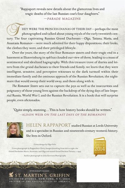A 12-WEEK NEW YORK TIMES BESTSELLER "Helen Rappaport paints a compelling portrait of the doomed grand duchesses." -People magazine "The public spoke of the sisters in a gentile, superficial manner, but Rappaport captures sections of letters and diary entries to showcase the sisters' thoughtfulness and intelligence." -Publishers Weekly (starred review) From the New York Times bestselling author of The Last Days of the Romanovs and Caught in the Revolution, The Romanov Sisters reveals the untold stories of the four daughters of Nicholas and Alexandra. They were the Princess Dianas of their day-perhaps the most photographed and talked about young royals of the early twentieth century. The four captivating Russian Grand Duchesses-Olga, Tatiana, Maria and Anastasia Romanov-were much admired for their happy dispositions, their looks, the clothes they wore and their privileged lifestyle. Over the years, the story of the four Romanov sisters and their tragic end in a basement at Ekaterinburg in 1918 has clouded our view of them, leading to a mass of sentimental and idealized hagiography. With this treasure trove of diaries and letters from the grand duchesses to their friends and family, we learn that they were intelligent, sensitive and perceptive witnesses to the dark turmoil within their immediate family and the ominous approach of the Russian Revolution, the nightmare that would sweep their world away, and them along with it. The Romanov Sisters sets out to capture the joy as well as the insecurities and poignancy of those young lives against the backdrop of the dying days of late Imperial Russia, World War I and the Russian Revolution. Helen Rappaport aims to present a new and challenging take on the story, drawing extensively on previously unseen or unpublished letters, diaries and archival sources, as well as private collections. It is a book that will surprise people, even aficionados.