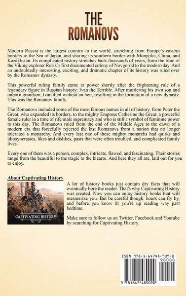 If you want to discover the captivating history of the Romanovs, then keep reading... An undoubtedly interesting, exciting, and dramatic chapter of Russian history was ruled over by the Romanov dynasty. This powerful ruling family came to power shortly after the frightening rule of a legendary figure in Russian history: Ivan the Terrible. After murdering his own son and unborn grandson, Ivan died without an heir, resulting in the formation of a new dynasty. This was the Romanov family. The Romanovs included some of the most famous names in all of history, from Peter the Great, who expanded its borders, to the mighty Empress Catherine the Great, a powerful female ruler in a time of rife male supremacy and who is still a symbol of feminine power to this day. The Romanovs ruled from the end of the Middle Ages to the dawn of a modern era that forcefully rejected the last Romanovs from a nation that no longer tolerated a monarchy. And every last one of these mighty monarchs had quirks and idiosyncrasies, likes and dislikes, pasts that were often troubled, and complicated family lives. Every one of them was a person, complex, intricate, flawed, and fascinating. Their stories range from the beautiful to the tragic to the bizarre. And in this book, they all are laid out for you to enjoy. In The Romanovs: A Captivating Guide to the Last Imperial Dynasty to Rule Russia and the Impact the Romanov Family Had on Russian History, you will discover topics such asRussia Before the Romanovs The First Romanovs A Twisted Tutor The Sons of Alexei Peter the Great The First Empress Young Emperors and Empresses Catherine the Great The Mad Tsar Censorship and Emancipation A Bloody End to a Ruling Dynasty And much, much more! So if you want to learn more about the Romanovs, scroll up and click the "add to cart" button!