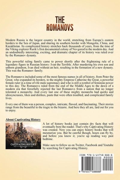 If you want to discover the captivating history of the Romanovs, then keep reading... An undoubtedly interesting, exciting, and dramatic chapter of Russian history was ruled over by the Romanov dynasty. This powerful ruling family came to power shortly after the frightening rule of a legendary figure in Russian history: Ivan the Terrible. After murdering his own son and unborn grandson, Ivan died without an heir, resulting in the formation of a new dynasty. This was the Romanov family. The Romanovs included some of the most famous names in all of history, from Peter the Great, who expanded its borders, to the mighty Empress Catherine the Great, a powerful female ruler in a time of rife male supremacy and who is still a symbol of feminine power to this day. The Romanovs ruled from the end of the Middle Ages to the dawn of a modern era that forcefully rejected the last Romanovs from a nation that no longer tolerated a monarchy. And every last one of these mighty monarchs had quirks and idiosyncrasies, likes and dislikes, pasts that were often troubled, and complicated family lives. Every one of them was a person, complex, intricate, flawed, and fascinating. Their stories range from the beautiful to the tragic to the bizarre. And in this book, they all are laid out for you to enjoy. In The Romanovs: A Captivating Guide to the Last Imperial Dynasty to Rule Russia and the Impact the Romanov Family Had on Russian History, you will discover topics such asRussia Before the Romanovs The First Romanovs A Twisted Tutor The Sons of Alexei Peter the Great The First Empress Young Emperors and Empresses Catherine the Great The Mad Tsar Censorship and Emancipation A Bloody End to a Ruling Dynasty And much, much more! So if you want to learn more about the Romanovs, scroll up and click the "add to cart" button!