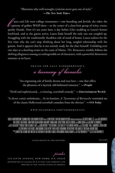 Galt Niederhoffer's The Romantics nimbly follows the shifting allegiances among an unforgettable set of characters, with a powerful, bittersweet romance at its heart, now a major motion picture starring Katie Holmes, Josh Duhamel, and Anna Paquin. Laura and Lila were college roommates--one brooding and Jewish, the other the epitome of golden WASP-dom. Now it's ten years later, a day before Lila's wedding to Laura's former boyfriend, and as the guests arrive, Laura finds herself the only one not coupled up. Struggling with the traditionally thankless role of maid of honor, Laura realizes for the first time why she can't stop thinking about her long, tangled relationship with the groom. And it appears that he is not entirely ready for the altar himself.