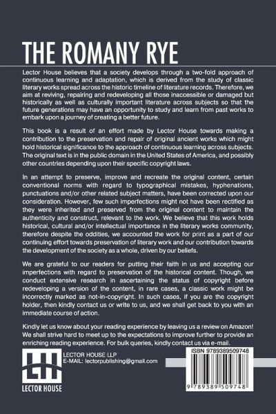 The Romany Rye This book is a result of an effort made by us towards making a contribution to the preservation and repair of original classic literature. In an attempt to preserve, improve and recreate the original content, we have worked towards: 1. Type-setting & Reformatting: The complete work has been re-designed via professional layout, formatting and type-setting tools to re-create the same edition with rich typography, graphics, high quality images, and table elements, giving our readers the feel of holding a 'fresh and newly' reprinted and/or revised edition, as opposed to other scanned & printed (Optical Character Recognition - OCR) reproductions. 2. Correction of imperfections: As the work was re-created from the scratch, therefore, it was vetted to rectify certain conventional norms with regard to typographical mistakes, hyphenations, punctuations, blurred images, missing content/pages, and/or other related subject matters, upon our consideration. Every attempt was made to rectify the imperfections related to omitted constructs in the original edition via other references. However, a few of such imperfections which could not be rectified due to intentional\unintentional omission of content in the original edition, were inherited and preserved from the original work to maintain the authenticity and construct, relevant to the work. We believe that this work holds historical, cultural and/or intellectual importance in the literary works community, therefore despite the oddities, we accounted the work for print as a part of our continuing effort towards preservation of literary work and our contribution towards the development of the society as a whole, driven by our beliefs. We are grateful to our readers for putting their faith in us and accepting our imperfections with regard to preservation of the historical content. HAPPY READING!