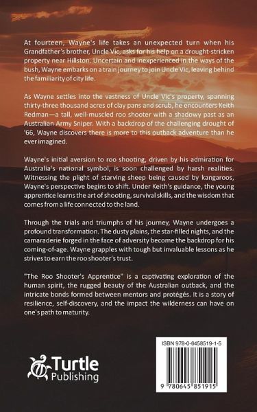 At fourteen, Wayne's life takes an unexpected turn when his Grandfather's brother, Uncle Vic, asks for his help on a drought-stricken property near Hillston. Uncertain and inexperienced in the ways of the bush, Wayne embarks on a train journey to join Uncle Vic, leaving behind the familiarity of city life. As Wayne settles into the vastness of Uncle Vic's property, spanning thirty-three thousand acres of clay pans and scrub, he encounters Keith Redman-a tall, well-muscled roo shooter with a shadowy past as an Australian Army Sniper. With a backdrop of the challenging drought of '66, Wayne discovers there is more to this outback adventure than he ever imagined. Wayne's initial aversion to roo shooting, driven by his admiration for Australia's national symbol, is soon challenged by harsh realities. Witnessing the plight of starving sheep being caused by kangaroos, Wayne's perspective begins to shift. Under Keith's guidance, the young apprentice learns the art of shooting, survival skills, and the wisdom that comes from a life connected to the land. Through the trials and triumphs of his journey, Wayne undergoes a profound transformation. The dusty plains, the star-filled nights, and the camaraderie forged in the face of adversity become the backdrop for his coming-of-age. Wayne grapples with tough but invaluable lessons as he strives to earn the roo shooter's trust. The Roo Shooter's Apprentice is a captivating exploration of the human spirit, the rugged beauty of the Australian outback, and the intricate bonds formed between mentors and protégés. It is a story of resilience, self-discovery, and the impact the wilderness can have on one's path to maturity.