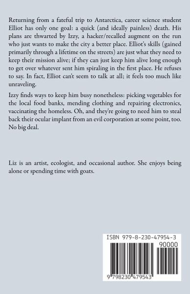 Returning from a fateful trip to Antarctica, career science student Elliot has only one goal: a quick (and ideally painless) death. His plans are thwarted by Izzy, a hacker/recalled augment on the run who just wants to make the city a better place. Elliot's skills (gained primarily through a lifetime on the streets) are just what they need to keep their mission alive; if they can just keep him alive long enough to get over whatever sent him spiraling in the first place. He refuses to say. In fact, Elliot can't seem to talk at all; it feels too much like unraveling. Izzy finds ways to keep him busy nonetheless: picking vegetables for the local food banks, mending clothing and repairing electronics, vaccinating the homeless. Oh, and they're going to need him to steal back their ocular implant from an evil corporation at some point, too. No big deal.