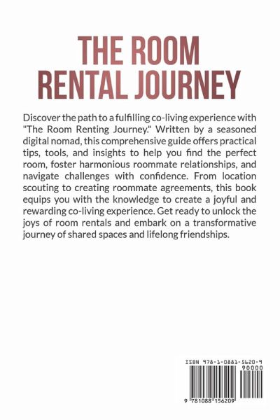 Maybe you're a college student looking for a space that fits your budget and study needs. Perhaps you're dusting off the debris of a tough breakup and searching for a fresh start. You might be someone who simply dislikes the idea of coming home to an empty house and prefers the lively vibe of shared living. Or you might be a travel enthusiast, a digital nomad, always on the move, and yearning for a living arrangement that doesn't chain you down. Whatever the case, you're wondering if renting a room could be the right fit for you. After all, it's far more affordable and flexible than renting a house or apartment by yourself, and it offers all of the amenities at a fraction of the cost. Room rentals might seem like an easy-breezy solution, but like most things in life, they come with their own set of unique challenges. Jumping into the world of room rentals without being well-equipped is like jumping into the deep end of a pool without knowing how to swim. It's essential to get your bearings right, or things can go south quickly. To truly unlock the benefits of room rentals, you need a roadmap, and that's where this book comes in. It's more than just a guide-it's a trusted companion to help you navigate through the potential pitfalls and highlights of the room rental landscape. "The Room Renting Journey" takes you by the hand from the very beginning: determining what you want, identifying the perfect room, adapting to co-living, and even guiding you through the moving out process when the time comes. It also comes with worksheets, checklists, sample letters and other practical resources that are designed to empower you to make informed decisions and keep your room rental adventure as smooth and rewarding as possible. It's a must-have tool on your journey to a fulfilling room rental experience.