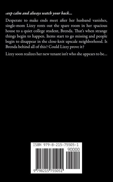 Keep calm and always watch your back... Desperate to make ends meet after her husband vanishes, single-mom Lizzy rents out the spare room in her spacious house to a quiet college student, Brenda. That's when strange things begin to happen. Items start to go missing and people begin to disappear in the close-knit upscale neighborhood. Is Brenda behind all of this? Could Lizzy prove it? Lizzy soon realizes her new tenant isn't who she appears to be...