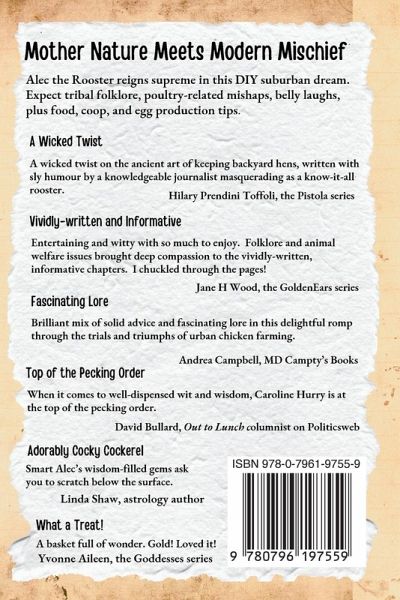 Wisdom, Wisecracks, and Well-grounded Advice Blending the wisdom of folklore, the charm of a memoir, and the punchlines of a stand-up routine, Smart Alec, King of the Heap, struts between practical chicken-raising tips and existential musings in The Rooster Diaries. Expect fresh and hilarious perspectives on coop tribulations and human complexities as author Caroline Hurry bridges chicken-keeping with suburban tribal customs. Whether you're looking to keep hens for fresh, delicious eggs or to become more conscious about what you eat, you'll find the inside scoops on coops, food, and egg production. From coop maintenance to the daily rituals of feeding and care, Smart Alec, Cock of the Walk holds forth on everything from predator problems to pasty butt. Ethical and humane chicken-keeping practices take center stage. Giving your hens the best life possible is how you produce delicious eggs. Smart Alec's witty reflections will resonate with anyone seeking a deeper connection to nature and a more self-sufficient lifestyle. Enjoy the light-hearted perspective of a rooster who knows the ropes.