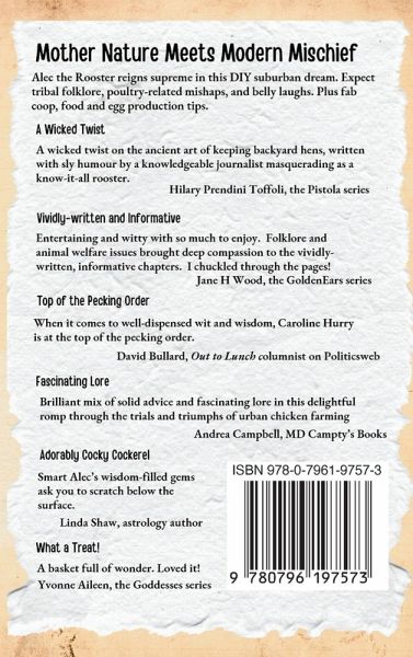 Wisdom, Wisecracks, and Well-grounded Advice Blending the wisdom of folklore, the charm of a memoir, and the punchlines of a stand-up routine, Smart Alec, King of the Heap, struts between practical chicken-raising tips and existential musings in The Rooster Diaries. Expect fresh and hilarious perspectives on coop tribulations and human complexities as author Caroline Hurry bridges chicken-keeping with suburban tribal customs. Whether you're looking to keep hens for fresh, delicious eggs or to become more conscious about what you eat, you'll find the inside scoops on coops, food, and egg production. From coop maintenance to the daily rituals of feeding and care, Smart Alec, Cock of the Walk holds forth on everything from predator problems to pasty butt. Ethical and humane chicken-keeping practices take center stage. Giving your hens the best life possible is how you produce delicious eggs. Smart Alec's witty reflections will resonate with anyone seeking a deeper connection to nature and a more self-sufficient lifestyle. Enjoy the light-hearted perspective of a rooster who knows the ropes.