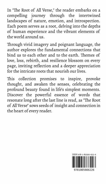 In "The Root of All Verse," the reader embarks on a compelling journey through the intertwined landscapes of nature, emotion, and introspection. Each poem serves as a root, delving into the depths of human experience and the vibrant elements of the world around us. Through vivid imagery and poignant language, the author explores the fundamental connections that bind us to each other and to the earth. Themes of love, loss, rebirth, and resilience blossom on every page, inviting reflection and a deeper appreciation for the intricate roots that nourish our lives. This collection promises to inspire, provoke thought, and awaken the senses, celebrating the profound beauty found in life's simplest moments. Discover the powerful essence of words that resonate long after the last line is read, as "The Root of All Verse" sows seeds of insight and connection in the heart of every reader.