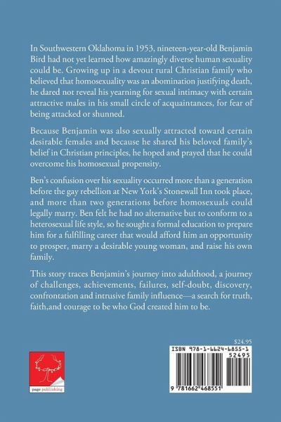 In Southwestern Oklahoma in 1953, nineteen-year-old Benjamin Bird had not yet learned how amazingly diverse human sexuality could be. Growing up in a devout rural Christian family who believed that homosexuality was an abomination justifying death, he dared not reveal his yearning for sexual intimacy with certain attractive males in his small circle of acquaintances, for fear of being attacked or shunned. Because Benjamin was also sexually attracted toward certain desirable females and because he shared his beloved family's belief in Christian principles, he hoped and prayed that he could overcome his homosexual propensity. Ben's confusion over his sexuality occurred more than a generation before the gay rebellion at New York's Stonewall Inn took place, and more than two generations before homosexuals could legally marry. Ben felt he had no alternative but to conform to a heterosexual life style, so he sought a formal education to prepare him for a fulfilling career that would afford him an opportunity to prosper, marry a desirable young woman, and raise his own family. This story traces Benjamin's journey into adulthood, a journey of challenges, achievements, failures, self-doubt, discovery, confrontation and intrusive family influence--a search for truth, faith, and courage to be who God created him to be.