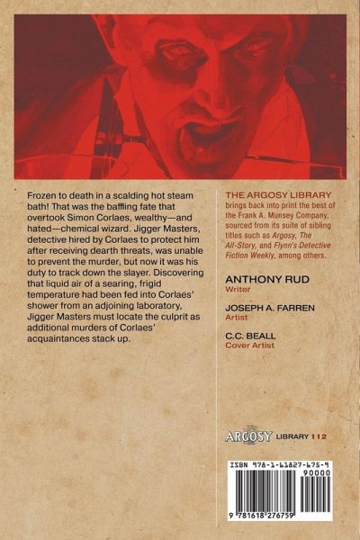 Frozen to death in a scalding hot steam bath! That was the baffling fate that overtook Simon Corlaes, wealthy-and hated-chemical wizard. Jigger Masters, detective hired by Corlaes to protect him after receiving dearth threats, was unable to prevent the murder, but now it was his duty to track down the slayer. Discovering that liquid air of a searing, frigid temperature had been fed into Corlaes' shower from an adjoining laboratory, Jigger Masters must locate the culprit as additional murders of Corlaes' acquaintances stack up.