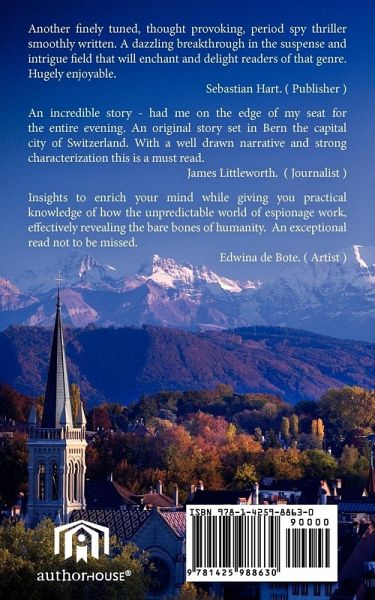 Another finely tuned, thought provoking, period spy thriller smoothly written. A dazzling breakthrough in the suspense and intrigue field that will enchant and delight readers of that genre. Hugely enjoyable. Sebastian Hart. ( Publisher ) An incredible story - had me on the edge of my seat for the entire evening. An original story set in Bern the capital city of Switzerland. With a well drawn narrative and strong characterization this is a must read. James Littleworth. ( Journalist ) Insights to enrich your mind while giving you practical knowledge of how the unpredictable world of espionage work, effectively revealing the bare bones of humanity. An exceptional read not to be missed. Edwina de Bote. ( Artist )