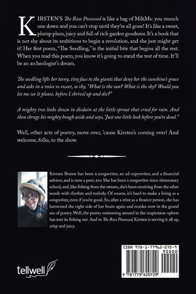 Kirsten Brawn has been a songwriter, an ad copywriter, and a financial advisor, and is now a poet, too. She has been a songwriter since elementary school, and, like fishing from the stream, she's been receiving from the ether words with rhythm and melody. Of course, it's hard to make a living as a songwriter, even if you're good. So, after a stint as a finance person, she has harnessed the right side of her brain again and resides now in the grand sea of poetry. Well, the poetry swimming around in the inspiration-sphere has met its fishing net. And in The Rose Possessed, Kirsten is serving it all up, crisp and juicy.