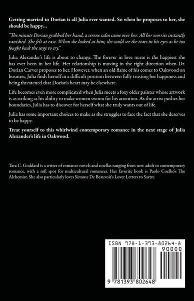 Getting married to Dorian is all Julia ever wanted. So when he proposes to her, she should be happy… "The minute Dorian grabbed her hand, a serene calm came over her. All her worries instantly vanished. She felt at ease. When she looked at him, she could see the tears in his eyes as he too fought back the urge to cry." Julia Alexander's life is about to change. The forever in love nurse is the happiest she has ever been in her life. Her relationship is moving in the right direction when Dr. Dorian Carver proposes to her. However, when an old flame of his comes to Oakwood on business, Julia finds herself in a difficult position between fully trusting her happiness and being threatened that Dorian's heart may be elsewhere. Life becomes even more complicated when Julia meets a foxy older painter whose artwork is as striking as his ability to make women swoon for his attention. As the artist pushes her boundaries, Julia has to discover for herself what she truly wants out of life. Julia has some important choices to make as she struggles to face the fact that she deserves to be happy. Treat yourself to this whirlwind contemporary romance in the next stage of Julia Alexander's life in Oakwood.