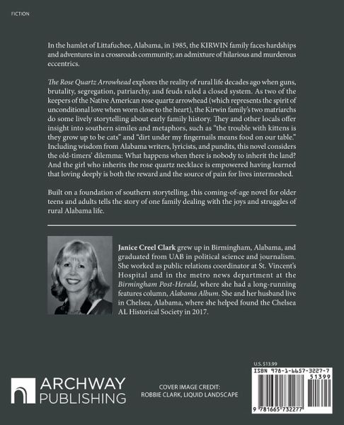 In the hamlet of Littafuchee, Alabama, in 1985, the KIRWIN family faces hardships and adventures in a crossroads community, an admixture of hilarious and murderous eccentrics. The Rose Quartz Arrowhead explores the reality of rural life decades ago when guns, brutality, segregation, patriarchy, and feuds ruled a closed system. As two of the keepers of the Native American rose quartz arrowhead (which represents the spirit of unconditional love when worn close to the heart), the Kirwin family's two matriarchs do some lively storytelling about early family history. They and other locals offer insight into southern similes and metaphors, such as "the trouble with kittens is they grow up to be cats" and "dirt under my fingernails means food on our table." Including wisdom from Alabama writers, lyricists, and pundits, this novel considers the old-timers' dilemma: What happens when there is nobody to inherit the land? And the girl who inherits the rose quartz necklace is empowered having learned that loving deeply is both the reward and the source of pain for lives intermeshed. Built on a foundation of southern storytelling, this coming-of-age novel for older teens and adults tells the story of one family dealing with the joys and struggles of rural Alabama life.
