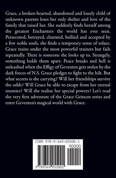 Grace, a broken-hearted, abandoned and lonely child of unknown parents loses her only shelter and love of the family that raised her. She suddenly finds herself among the greatest Enchanters the world has ever seen. Persecuted, betrayed, charmed, bullied and accepted by a few noble souls, she finds a temporary sense of solace. Grace trains under the most powerful trainers but fails repeatedly. There is someone she looks up to. Strangely, something holds them apart. Peace breaks and hell is unleashed when the Effigy of Geventen gets stolen by the dark forces of N.S. Grace pledges to fight to the hilt. But what secrets is she carrying? Will her friendships survive the odds? Will Grace be able to escape from her eternal enemies? Will she realize her special powers? Let's read the very first adventure of the Grace Grincen series and enter Geventen's magical world with Grace.