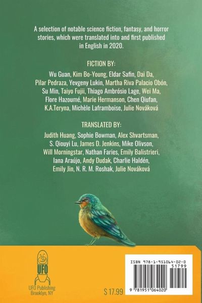 A selection of notable science fiction, fantasy, and horror stories, which were translated into and first published in English in 2020. This anthology features the winning entry and the stories shortlisted for the Science Fiction and Fantasy Rosetta Awards. The following stories are included: ROESIN by Wu Guan, translated from the Chinese by Judith Huang WHALE SNOWS DOWN by Kim Bo-Young, translated from the Korean by Sophie Bowman THE GREEN HILLS OF DIMITRY TOTZKIY by Eldar Safin, translated from the Russian by Alex Shvartsman RAISING MERMAIDS by Dai Da, translated from the Chinese by S. Qiouyi Lu MATER TENEBRARUM by Pilar Pedraza, translated from the Spanish by James D. Jenkins VIK FROM PLANET EARTH by Yevgeny Lukin, translated from the Russian by Mike Olivson BIOGRAPHY OF ALGAE by Martha Riva Palacio Obón, translated from the Spanish by Will Morningstar THE POST-CONSCIOUS AGE by Su Min, translated from the Chinese by Nathan Faries JUST LIKE MIGRATORY BIRDS by Taiyo Fujii, translated from the Japanese by Emily Balistrieri THE WITCH DANCES by Thiago Ambrósio Lage, translated from the Portuguese by Iana Araújo FORMERLY SLOW by Wei Ma, translated from the Chinese by Andy Dudak MENOPAUSE by Flore Hazoumé, translated from the French by James D. Jenkins THE MOLE KING by Marie Hermanson, translated from the Swedish by Charlie Haldén THE ANCESTRAL TEMPLE IN A BOX by Chen Qiufan, translated from the Chinese by Emily Jin NO ONE EVER LEAVES PORT HENRI by K.A. Teryna, translated from the Russian by Alex Shvartsman COUSIN ENTROPY by Michèle Laframboise, translated from the French by N. R. M. Roshak THE CURTAIN FALLS, THE SHOW MUST END by Julie Nováková, translated from the Czech by the author