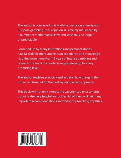 The author is convinced that Roulette over a long time is not just pure gambling. In his opinion, it is mainly influenced by a number of mathematical laws and stays thus no longer unpredictable.Loosened up by many illustrations and personal stories, Paul M. Goldek offers you his own experience and knowledge resulting from more than 15 years of intense gambling and research. He leads the reader in logical steps up to a very promising level.The author explains precicely and in detail how things in the future can turn out for the best by using which approach.This book will not only interest the experienced ones among us but is also very helpful for rookies. All of them will get many important recommendations and thought-provoking impulses.