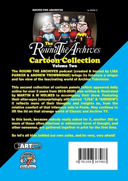 The ROUND THE ARCHIVES podcast (created & hosted by LISA PARKER & ANDREW TROWBRIDGE) brings its listeners a unique and fun view of the fascinating world of Archive Television. This second collection of cartoon panels (which appeared daily online for over 2 years from 2018-2020) was written & illustrated by MARTIN A W HOLMES to accompany their show. Featuring their alter-egos (unsurprisingly still named "LISA" & "ANDREW") it reflects more of their thoughts and insights as, from the relative comfort of that infamous sofa in Poole, they continue to lift the lid on that strange world of Classic and Archive TV. In this book, because nobody really asked for it, another 300 or more of those often hilarious or whimsical turns of thought, and other nonsense, are gathered together in print for the first time. So let's all hide behind our own sofas, and be very, very afraid!