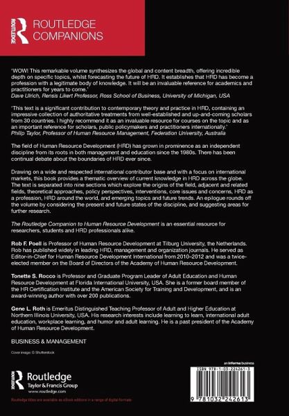 The field of Human Resource Development (HRD) has grown in prominence as an independent discipline from its roots in both management and education since the 1980s. There has been continual debate about the boundaries of HRD ever since. Drawing on a wide and respected international contributor base and with a focus on international markets, this book provides a thematic overview of current knowledge in HRD across the globe. The text is separated into nine sections which explore the origins of the field, adjacent and related fields, theoretical approaches, policy perspectives, interventions, core issues and concerns, HRD as a profession, HRD around the world, and emerging topics and future trends. An epilogue rounds off the volume by considering the present and future states of the discipline, and suggesting areas for further research. The Routledge Companion to Human Resource Development is an essential resource for researchers, students and HRD professionals alike.