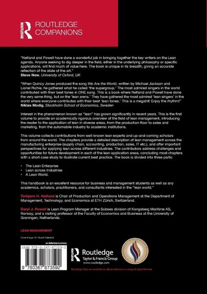 Interest in the phenomenon known as "lean" has grown significantly in recent years. This is the first volume to provide an academically rigorous overview of the field of lean management, introducing the reader to the application of lean in diverse application areas, from the production floor to sales and marketing, from the automobile industry to academic institutions. The volume collects contributions from well-known lean experts and up-and-coming scholars from around the world. The chapters provide a detailed description of lean management across the manufacturing enterprise (supply chain, accounting, production, sales, IT etc.), and offer important perspectives for applying lean across different industries (construction, healthcare, logistics). The contributors address challenges and opportunities for future development in each of the lean application areas, concluding most chapters with a short case study to illustrate current best practice. The book is divided into three parts: The Lean Enterprise Lean across Industries A Lean World. This handbook is an excellent resource for business and management students as well as any academics, scholars, practitioners, and consultants interested in the "lean world."