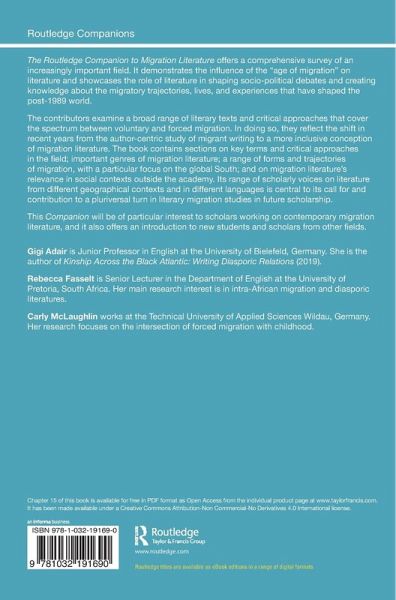 The contributors examine a broad range of literary texts and critical approaches that cover the spectrum between voluntary and forced migration. In doing so, they reflect the shift in recent years from the author-centric study of migrant writing to a more inclusive conception of migration literature. The book contains sections on key terms and critical approaches in the field; important genres of migration literature; a range of forms and trajectories of migration, with a particular focus on the global South; and on migration literature's relevance in social contexts outside the academy. Its range of scholarly voices on literature from different geographical contexts and in different languages is central to its call for and contribution to a pluriversal turn in literary migration studies in future scholarship.