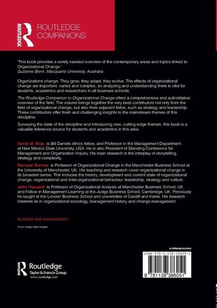 David M. Boje is Bill Daniels ethics fellow, and Professor in the Management Department at New Mexico State University, USA. He is also President of Standing Conference for Management & Organization Inquiry. His main research is the interplay of storytelling, strategy and complexity. Bernard Burnes is Professor of Organizational Change in the Manchester Business School at the University of Manchester, UK. His teaching and research cover organizational change in its broadest sense. This includes the history, development and current state of organizational change, organizational and inter-organizational behaviour, leadership, strategy and culture. John Hassard is Professor of Organizational Analysis at Manchester Business School, UK and Fellow in Management Learning at the Judge Business School, Cambridge, UK. Previously he taught at the London Business School and universities of Cardiff and Keele. His research interests lie in organizational sociology, management history and change management.