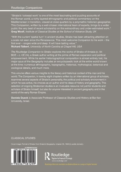 The Routledge Companion to Strabo explores the works of Strabo of Amasia (c. 64 BCE - c. CE 24), a Greek author writing at the prime of Roman expansion and political empowerment. While his earlier historiographical composition is almost entirely lost, his major opus of the Geography includes an encyclopaedic look at the entire world known at the time: numerous ethnographic, topographic, historical, mythological, botanical, and zoological details, and much more.