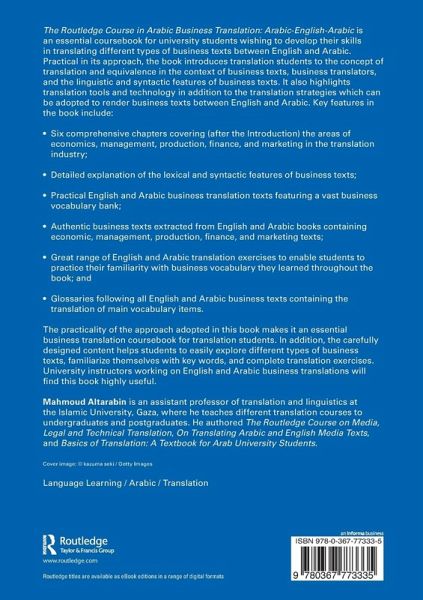 This book is an essential coursebook for students to develop their skills in translating different types of business texts between English and Arabic. It introduces students to the concept of translation and equivalence in the context of business texts, business translators, and the linguistic and syntactic features of business texts.