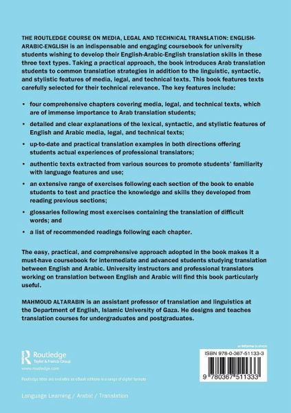 The Routledge Course on Media, Legal and Technical Translation is an indispensable and engaging coursebook for university students wishing to develop their English-Arabic-English translation skills in these three text types.