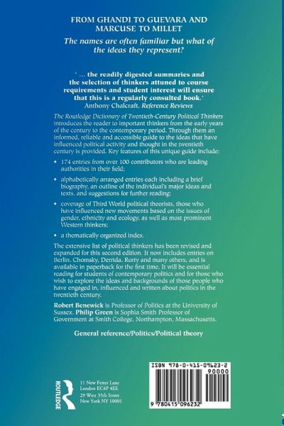 This edition has been revised and extended to include eleven new entries on Berlin, Chomsky, Derrida, Rorty and many others. Key features of this unique guide include: * 170 entries from 96 contributors, many of whom are leading authorities in their field * alphabetically arranged entries which include brief biographies, outlines of major ideas and suggestions for further reading * coverage of Western and Third World political theorists as well as those who have influenced new movements based on the issues of ethnicity, gender and ecology * a thematically organised index