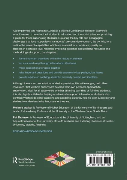 Accompanying The Routledge Doctoral Student's Companion this book examines what it means to be a doctoral student in education and the social sciences, providing a guide for those supervising students. Exploring the key role and pedagogical challenges that face supervisors in students' personal development, the contributors outline the research capabilities which are essential for confidence, quality and success in doctorate level research. Providing guidance about helpful resources and methodological support, the chapters: frame important questions within the history of debates act as a road map through international literatures make suggestions for good practice raise important questions and provide answers to key pedagogical issues provide advice on enabling students' scholarly careers and identities. While there is no one solution to ideal supervision, this wide-ranging text offers resources that will help supervisors develop their own personal approach to supervision. Ideal for all supervisors whether assisting part-time of full-time students, it is also highly suitable for helping academics to support international students who confront Western doctoral traditions and academic cultures, helping both supervisor and student to understand why things are as they are.