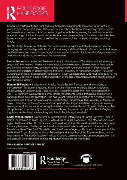Sameh Hanna is an Associate Professor in Arabic Literature and Translation at the University of Leeds, UK. His research interests include sociology of translation, Shakespeare in Arab culture, and translating sacred texts, on which he has published numerous articles in peer-reviewed journals and chapters in edited volumes. His book, Bourdieu in Translation Studies: The Socio-Cultural Dynamics of Shakespeare Translation in Egypt was published with Routledge in 2016. He is currently working on a book on the translation of the Bible into Arabic and the construction of Arab Christian identity. Hanem El-Farahaty is a Lecturer in Arabic, Arabic/English Translation, and Interpreting at the Centre for Translation Studies (CTS) and Arabic, Islamic and Middle Eastern Studies at the University of Leeds (AIMES), UK. She is AIMES Research Leader and PGR representative. In 2011, El-Farahaty was awarded a PhD for her research into Arabic translation studies with a particular focus on legal translation. She has taught Arabic and translation at a number of UK universities and English Linguistics and English/Arabic Translation at the University of Mansoura, Egypt. El-Farahaty is the author of Arabic-English-Arabic Legal Translation, a ground-breaking investigation of the issues found in legal translation between Arabic and English. El-Farahaty has also published a number of journal articles and book chapters in comparative Arabic/English linguistics, Arabic language teaching and Arabic/English legal translation. Abdel-Wahab Khalifa is a Lecturer in Translation and Interpreting at Cardiff University. Prior to Cardiff, he lectured at Tanta University, with which he is still associated, and other universities in Egypt, Austria and the UK. He has also been working as a professional translator and interpreter for nearly ten years. Khalifa has published and reviewed several articles and is the editor of Translators Have Their Say? Translation and the Power of Agency. He is also the recipient of the 2019 Alfred A. and Blanche W. Knopf Fellowship and a member of the Executive Board of the Association for Translation Studies in Africa. Khalifa is currently working on a monograph on the sociocultural determinants of translating modern Arabic fiction into English.