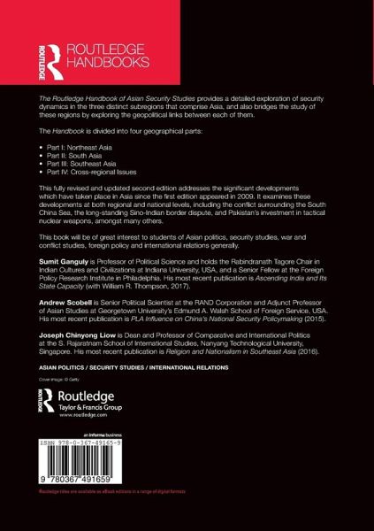 The Routledge Handbook of Asian Security Studies provides a detailed exploration of security dynamics in the three distinct subregions that comprise Asia, and also bridges the study of these regions by exploring the geopolitical links between each of them. The Handbook is divided into four geographical parts: Part I: Northeast Asia Part II: South Asia Part III: Southeast Asia Part IV: Cross-regional Issues This fully revised and updated second edition addresses the significant developments which have taken place in Asia since the first edition appeared in 2009. It examines these developments at both regional and national levels, including the conflict surrounding the South China Sea, the long-standing Sino-Indian border dispute, and Pakistan's investment in tactical nuclear weapons, amongst many others. This book will be of great interest to students of Asian politics, security studies, war and conflict studies, foreign policy and international relations generally.