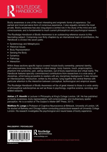 Adrian J.T. Alsmith is Lecturer in Philosophy at King's College London, UK. He has published on bodily awareness, body representation, self-consciousness, and multisensory spatial perception. He is co-editor of The Subject's Matter (MIT Press, 2017). Matthew R. Longo is Professor of Cognitive Neuroscience at Birkbeck, University of London, UK. He studied at Berkeley and Chicago before conducting postdoctoral research at University College London. His research investigates the psychological and neural bases of bodily experience.