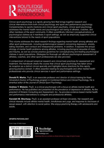Donald R. Marks, PsyD, is an associate professor and director of clinical training for Kean University's Doctor of Psychology program in Combined School and Clinical Psychology. He is emeritus editor of the Journal of Clinical Sport Psychology. Andrew T. Wolanin, PsyD, is a clinical psychologist with a focus on athlete mental health and performance. He has published and presented on the prevalence of depression in athletes. As the president of Wolanin Consulting and Assessment, Inc., he provides evidence-based mental health and performance interventions to collegiate and professional athletes. Kendahl M. Shortway, PsyD, is an assistant professor at Kean University. Her research and clinical interests include athlete mental health, mindfulness and yoga, and response to disclosure of sexual assault, with attention to social justice. She enjoys practicing therapy with adolescents and adults.