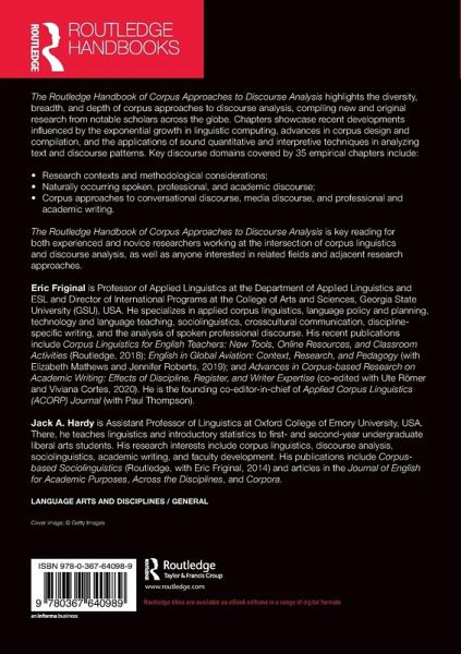 The Routledge Handbook of Corpus Approaches to Discourse Analysis is key reading for both experienced and novice researchers working at the intersection of corpus linguistics and discourse analysis, as well as anyone undertaking study in these areas, as well as anyone interested in related fields and adjacent research approaches.