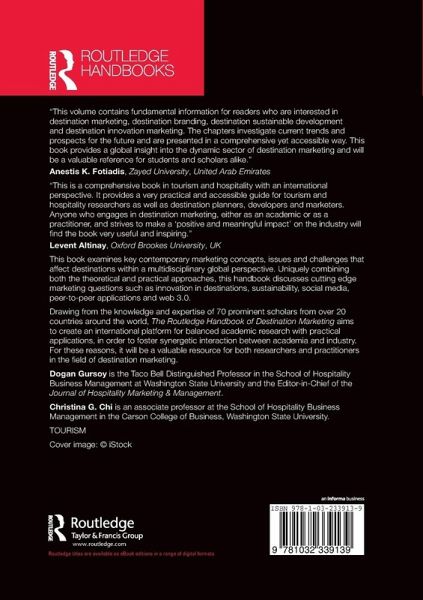 Drawing from the knowledge and expertise of 70 prominent scholars from over 20 countries around the world, The Routledge Handbook of Destination Marketing aims to create an international platform for balanced academic research with practical applications, in order to foster synergetic interaction between academia and industry. For these reasons, it will be a valuable resource for both researchers and practitioners in the field of destination marketing.