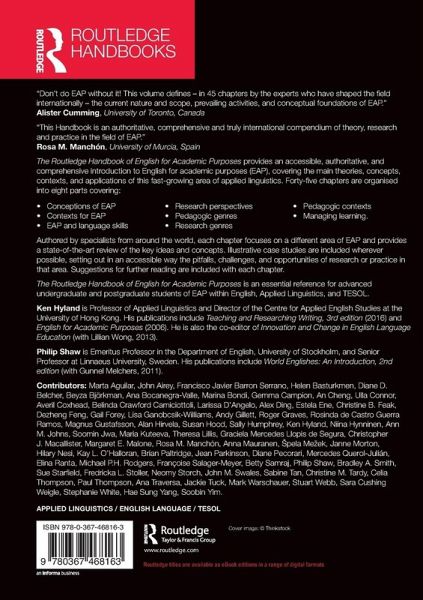 The Routledge Handbook of English for Academic Purposes provides an accessible, authoritative and comprehensive introduction to English for Academic Purposes (EAP), covering the main theories, concepts, contexts and applications of this fast-growing area of applied linguistics. Forty-five chapters are organised into eight sections covering: