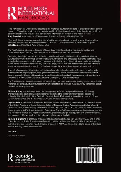 "This Handbook will undoubtedly become a key reference source for scholars of local government across the world. The editors are to be congratulated on highlighting in detail many distinctive elements of local government structure and process, across many international boundaries and national cultures. They demonstrate the importance of understanding how local government, despite its many tensions with central and regional government, continues to play a major role in most countries in delivering a wide range of essential public services, providing key social facilities, and regulating many aspects of social life to improve quality of life outcomes." - Tony Bovaird, Institute of Local Government Studies, University of Birmingham, UK