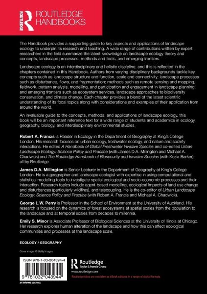 Robert A. Francis is Reader in Ecology in the Department of Geography at King's College London. His research focuses on urban ecology, freshwater ecology, and nature and society interactions. He edited A Handbook of Global Freshwater Invasive Species and co-edited Urban Landscape Ecology: Science Policy and Practice (with James D.A. Millington and Michael A. Chadwick) and The Routledge Handbook of Biosecurity and Invasive Species (with Kezia Barker), all by Routledge. James D.A. Millington is Senior Lecturer in the Department of Geography at King's College London. He is a geographer and landscape ecologist with expertise in using computational and statistical modelling tools to investigate spatial ecological and socio-economic processes and their interaction. Research topics include agent-based modelling, ecological impacts of land use change and disturbances (particularly wildfires), and telecoupling. He is the co-editor of Urban Landscape Ecology: Science Policy and Practice (with Robert A. Francis and Michael A. Chadwick). George L.W. Perry is Professor in the School of Environment at the University of Auckland. His research is focused on the dynamics of forest ecosystems at spatial scales from the population to the landscape and at temporal scales from decades to millennia. Emily S. Minor is Associate Professor of Biological Sciences at the University of Illinois at Chicago. Her research explores human alteration of the landscape and how this can affect ecological communities and processes at the landscape scale.