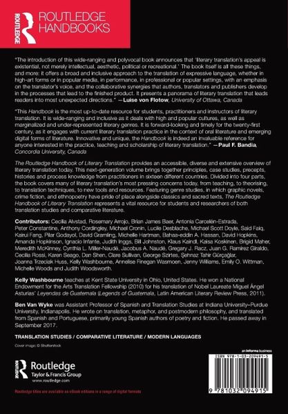 "This Handbook is the most up-to-date resource for students, practitioners and instructors of literary translation. It is wide-ranging and inclusive as it deals with high and popular cultures, as well as marginalized and under-represented literary genres. It is forward-looking and timely for the twent-first century as it engages with current literary translation practice in the context of oral literature and emerging digital forms of literature. Innovative and unique, the Handbook is indeed an invaluable reference for anyone interested in the practice, teaching and scholarship of literary translation." Paul F. Bandia, Concordia University, Canada