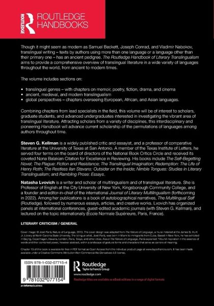 Though it might seem as modern as Samuel Beckett, Joseph Conrad, and Vladimir Nabokov, translingual writing - texts by authors using more than one language or a language other than their primary one - has an ancient pedigree. The Routledge Handbook of Literary Translingualism aims to provide a comprehensive overview of translingual literature in a wide variety of languages throughout the world, from ancient to modern times.