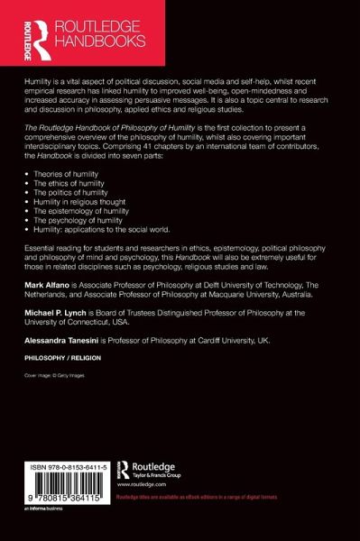 Introduction Mark Alfano, Michael P. Lynch and Alessandra Tanesini Part 1: Theories of Humility 1. Theories of Humility: An Overview Nancy Snow 2. I'm SO Humble!': On the Paradox of Humility Brian Robinson 3. Humility is not a Virtue Paul Bloomfield Part 2: The Ethics of Humility 4. Humility and Human Flourishing Robert Roberts 5. Humility and Self-Respect: Kantian and Feminist Perspectives Robin Dillon 6. The Puzzle of Humility and Disparity Dennis Whitcomb, Heather Battaly, Jason Baehr and Dan Howard-Snyder 7. Humility and Truth in Nietzsche: The Humblebrag of the Lambs Nickolas Pappas 8. The Comparative Concern in Humility and Romantic Love Aaron Ben-Ze'ev 9. Pride and Humility Michael Brady 10. Ashamed of Our Selves: Disabling Shame and Humility Eva Dadlez and Sarah Woolwine Part 3: The Politics of Humility 11. Humility and democracy Michael A. Neblo and Emily Ann Israelson 12. Humility and conviction Michael P. Lynch 13. Humility and the Toleration of Diverse Ideas Casey Johnson 14. Humility, Forgiveness and Restorative Justice: From the personal to the political Carl Stauffer 15. Can Humility be a Liberatory Virtue? Heather Battaly Part 4: Humility in Religious Thought 16. Humility among the ancient Greeks Sophie Grace Chappell 17. Aquinas on Humility and Relational Greatness Andrew Pinsent 18. Faith and Humility: Conflict or Concord? Dan Howard-Snyder and Daniel McKaughan 19. Humility in the Islamic Tradition Sophia Vasalou 20. Humility in Buddhism Nicolas Bommarito 21. Humility in Early Chinese Philosophy Alexus McCleod 22. Humility and the African Philosophy of Ubuntu Thaddeus Metz Part 5: The Epistemology of Humility 23. Intellectual Humility and Contemporary Epistemology: A critique of epistemic individualism, evidentialism and internalism John Greco 24. Humility and self-knowledge Alessandra Tanesini 25. Intellectual Humility and Epistemic Trust Katherine Dormandy 26. Intellectual Humility, Testimony and Epistemic Injustice Ian Church 27. False Intellectual Humility Allan Hazlett 28. Intellectual Humility and Argumentation Andrew Aberdein 29. Intellectual Humility and Assertion Adam Carter and Emma Gordon 30. Epistemic Humility in the Sciences Ian James Kidd 31. Ramseyan Humility James Van Cleve Part 6: The Psychology of Humility 32. Humility in Personality and Positive Psychology Peter Samuelson and Ian Church 33. Psychological Measurement of Humility Rick Hoyle and Elizabeth Krumrei Mancuso 34. The Moral Psychology of Humility: Epistemic and Ethical Alignment as Foundational to Moral Exemplarity Jen Cole Wright 35. The Role of Knowledge Calibration in Intellectual Humility Phil Fernbach and Nick Light Part 7: Humility: Applications to the Social World 36. Humility and Terrorism Studies Quassim Cassam 37. 'Knowledge is Power': Barriers to Intellectual Humility in the Classroom Lani Watson 38. Humility in Law Amalia Amaya 39. Extended Cognition and Humility Duncan Pritchard 40. Arrogance and Servility Online: Humility is not the Solution Neil Levy 41. Humility in networks Mark Alfano and Emily Sullivan. Index