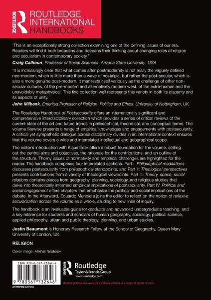 The Routledge Handbook of Postsecularity offers an internationally significant and comprehensive interdisciplinary collection which provides a series of critical reviews of the current state of the art and future trends in philosophical, theoretical, and conceptual terms. The volume likewise presents a range of empirical knowledges and engagements with postsecularity. A critical yet sympathetic dialogue across disciplinary divides in an international context ensures that the volume covers a wide and interrelated intellectual and geographical scope.